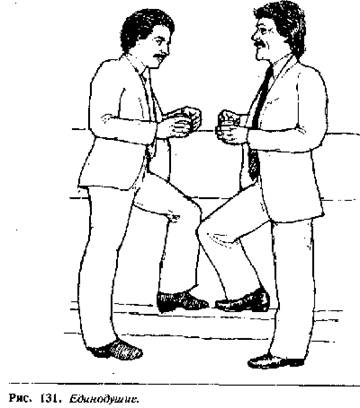 Очень интересно наблюдать за этим подсознательным ко-пированием. Посмотрите, например, на двух мужчин, изображенных на рис. 131, стоящих у стойки бара. Они отзеркаливают жесты друг друга, и можно предположить, что их мысли и чувства совпадают. Как только один человек скрещивает руки или ноги, другой делает то же самое. Как только один из них кладет руку в карман, другой повторяет его жест, и это копирование будет продолжаться до тех пор, пока они пребывают в согласии между собой. Это копирование часто присутствует в общении людей одинакового социального уровня, близких друзей, и часто можно увидеть, как одинаково ходят, стоят, сидят или двигаются супружеские пары. Шефлен заметил, что незнакомые между собой люди старательно избегают при общении одинаковых поз и положений тела. Отзеркаливание имеет огромное значение, поскольку это один из способов показать собеседнику, что вы с ним согласны, и он вам нравится. Сделать это можно простым копированием его жестов. Точно также по отзеркаливанию мы можем определить, что мы нравимся собеседнику, и он с нами согласен.