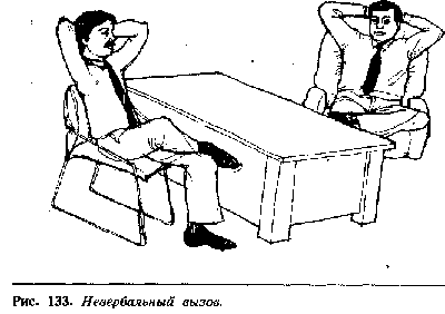 Если стул босса не имеет подлокотника (что маловероятно, потому что такой стул обычно ставят для посетителей), он может положить одну или обе ноги на стол (рис. 130). Если в комнату заходит его начальник, маловероятно, что босс будет применять такой откровенный жест собственника, он ограничится более изощренной позой, поставить ногу на нижний ящик письменного стола, например, или, если в столе нет ящиков, он уверенно поставит ногу рядом с ножкой стола, заявляя свое право собственности на него.