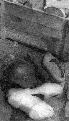 Захваченные танкистами трофеи – немецкая каска и деревянные ботинки – «клумпы»