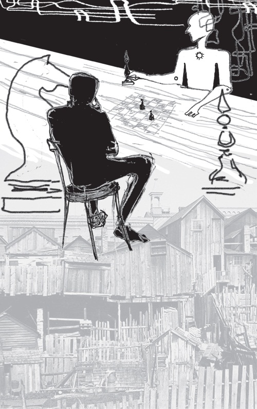 Играли они быстро. Моксон, делая свои ходы, почти не смотрел на доску, и мне, поскольку в шахматах я разбирался слабо, казалось, что он ходит первыми попавшимися под руку фигурами, – такими нервными и беспорядочными были его движения. Партнер Моксона играл в том же темпе, но его рука двигалась плавно, с механическим однообразием и, пожалуй, нарочитой театральностью. Сохранять неподвижность мне становилось все труднее. Я поежился – во всем этом мне чудилось что-то нереальное. Впрочем, я тогда был весь мокрый, да и замерз изрядно.
