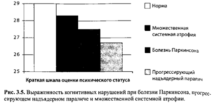 Когнитивные нарушения. Как и другие заболевания с преимущественным поражением подкорковых структур, МСА характеризуется наличием когнитивных нарушений, в структуру которых входят нарушения интеллекта, зрительно-пространственного гнозиса и праксиса, а также нарушения памяти, связанные с трудностями самостоятельного активного воспроизведения при относительной сохранности запоминания информации. Указанные нарушения аналогичны таковым при БП и ПНП, но выражены в меньшей степени (рис. 3.5). Деменция не характерна для МСА, хотя и не исключает этот диагноз. Относительная сохранность когнитивных функций при МСА объясняется тем, что нейродегенеративные изменения при этом заболевании преимущественно отмечаются в скорлупе и мало выражены в хвостатом ядре. Нейроны последнего интегрированы в фронто-стриарные круги, обеспечивающие регуляцию когнитивных функций, в то время как нейроны скорлупы в большей степени связаны с регуляцией движений [2, 22, 40].
