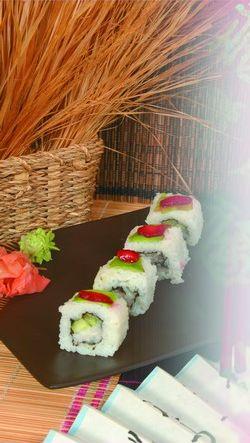 Рис промыть, залить 400 мл воды, варить на среднем огне под крышкой, пока он не станет вязким. Снять с огня, добавить уксус, сахар и соль, перемешать, оставить на 15 мин. Огурец вымыть, нарезать брусочками. Авокадо нарезать квадратиками, сбрызнуть лимонным соком. Мясо морского гребешка нарезать кусочками. Клубнику вымыть, удалить плодоножки, нарезать кусочками. Листья нори положить на бамбуковую циновку блестящей стороной вниз. Сверху ровным слоем распределить слегка охлажденный рис, накрыть все салфеткой и перевернуть, чтобы нори оказались сверху. Смазать нори небольшим количеством васаби и майонезом, выложить посередине кусочки огурца и морского гребешка, свернуть в виде рулета, придать ему прямоугольную форму и разрезать на 6 частей. Украсить каждую ломтиком авокадо и кусочком клубники. Подать роллы с васаби, тонко нарезанным имбирем и соевым соусом.