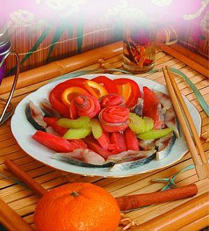 Филе сельди, горбуши и семги нарезать небольшими ломтиками. Помидор вымыть нарезать кружочками. Стебель сельдерея вымыть, нарезать. Апельсин вымыть, разрезать пополам, одну половинку нарезать кружочками, из второй выжать сок. Ломтики рыбы, кружочки помидора и апельсина, сельдерей красиво разложить по тарелкам, полить закуску апельсиновым соком, смешанным с саке.