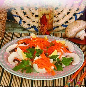 Яйца сварить вкрутую, охладить, очистить, нарезать ломтиками. Зелень петрушки вымыть. Грибы вымыть, обсушить, нарезать ломтиками, сбрызнуть смесью лимонного сока и соевого соуса, поставить на 30 мин, в холодильник. Выложить грибы, ломтики яиц и морковь на блюдо, украсить листиками петрушки.