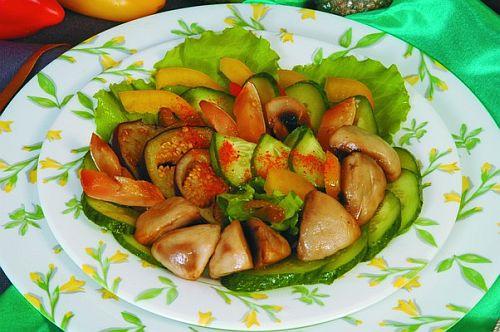 Баклажан вымыть, нарезать полукружиями. Шампинь-оны вымыть, крупно нарезать, обжарить вместе с баклажанами в растительном масле, добавить сое-вый соус, перемешать. Листья салата вымыть, обсушить, выложить на блюдо. Огурец вымыть, нарезать ломтиками, посолить. Болгарский перец вымыть, удалить плодоножку и семена, нарезать полосками. Огурцы и перец выложить на листья салата, сверху положить шампиньоны и баклажаны. Посыпать салат молотой паприкой.