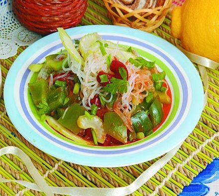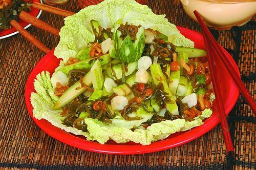 Лапшу отварить, откинуть на сито, охладить. Огурцы вымыть, нарезать соломкой. Листья салата и зелень кинзы вымыть, мелко нарезать. Смешать лапшу с огурцами, салатом и кинзой, полить заправкой, приготовленной из соевого соуса, оливкового масла и рисового уксуса. Салат охладить, перемешать и разложить по тарелкам.