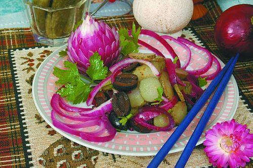 Репчатый лук будет иметь нежный вкус, если его тонко нарезать, обдать крутым кипятком и сразу же промыть холодной водой.