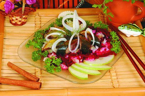 Свеклу и картофель вымыть, отварить, охладить, очис-тить и натереть на крупной терке. Яблоко вымыть, удалить сердцевину, нарезать тонкими дольками. Лук очистить, вымыть, нарезать кольцами. Зелень укропа и петрушки вымыть. Филе сельди нарезать небольшими кусочками. Для приготовления соуса смешать лимонный сок, мирин и растительное масло. Картофель и свеклу смешать, посолить, выложить на блюдо. Сверху выложить кусочки сельди и кольца лука. Полить салат приготовленным соусом, украсить зеленью укропа и петрушки.