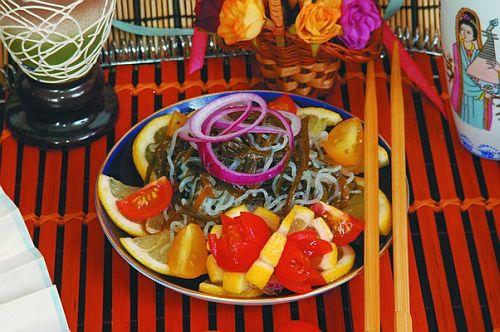 Рисовую лапшу отварить, откинуть на сито, охладить. Лук очистить, вымыть, нарезать кольцами. Помидоры вымыть, нарезать дольками или вырезать из них украшения. Лимон вымыть, нарезать фигурными ломтиками. Баклажаны нарезать соломкой. Смешать морскую капусту, лапшу, лук и баклажаны, заправить соусом, приготовленным из растительного масла и соевого соуса. Разложить салат по тарелкам, украсить ломтиками лимона и помидорами.