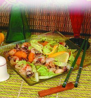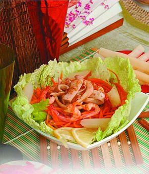 Креветки отварить в подсоленной воде, охладить, очистить. Кальмары промыть, снять кожицу, отварить в подсоленной воде, охладить, нарезать соломкой. Спаржу нарезать небольшими кусочками. Зелень сельдерея вымыть. Листья капусты вымыть, обсушить, выложить на блюдо. Для приготовления соуса смешать растительное масло с лимонным соком и паприкой. Смешать креветки, кальмары, морковь и спаржу, выложить на листья капусты. Полить салат приготовленным соусом, украсить ломтиками лимона и листиками сельдерея.