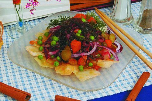 Картофель и морковь вымыть, отварить в подсоленной воде, охладить, очистить, нарезать кубиками. Зеленый горошек отварить в подсоленной воде, откинуть на сито. Лук очистить, вымыть, нарезать полукольцами. Соленый огурец нарезать кружочками. Укроп вымыть. Для приготовления соуса смешать рисовый уксус с растительным маслом и сахаром. Смешать белокочанную и морскую капусту, лук, морковь, картофель и зеленый горошек. Разложить салат по тарелкам, полить приготовленным соусом и украсить листиками укропа.