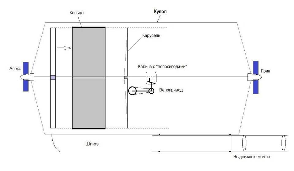 Широкая четырёхметровая втулка-цилиндр нужна для коммуникаций с вращающимся блоком. Прежде всего, водоснабжения. Но не только. Вода, которая при раскрутке распределится по краям катушки, будет выполнять функцию стабилизатора центра масс. Он всегда должен «сидеть» на центральной геометрической оси, совпадающей с осью вращения. Внутренние перемещения масс могут быть разными: доставили какой-то груз, что-то наоборот, надо вынести, космонавт пришёл в свою каюту, а другой ушёл. И каждый раз центр масс всей системы будет уходить в сторону и могут возникнуть никому не нужные паразитные биения. Превращать «Обь» в эксцентрик мне не хочется. Увеличится нагрузка на подшипники, может случиться разгерметизация, нафига мне такие проблемы?