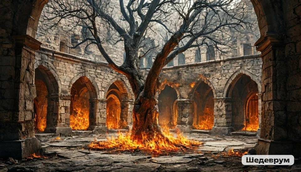 Посреди двора скрючилась старая, почти облетевшая, на три четверти высохшая черешня. Пять рыжих листиков трепетали на её узловатых ветвях. Она помнила меня ребёнком, помнила моего отца и мать… У неё были сладкие, нежные, крупные плоды. Я помню их вкус, их плоть… А потом она кормила ими моих врагов. Их рвали, ими наслаждались варвары, потопившие моё королевство в огне и крови.