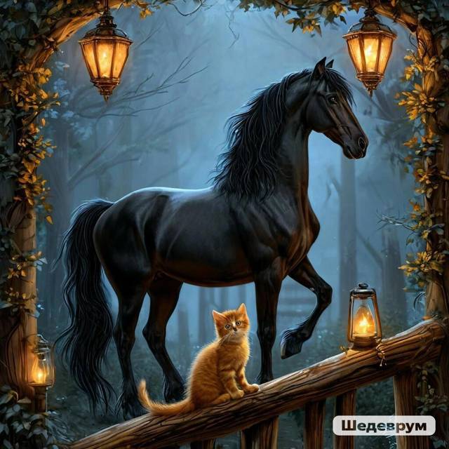 Бертран поднял котёнка, чтобы ему лучше был виден вороной: все же знают, что кошки видят в темноте. Но непослушный Ветер извернулся, вцепился в руку коготками и протестующе замяукал, а его глаза зажглись изумрудными фонариками. Принц расстроился: и что теперь делать? Котёнок так рвался из рук, что пришлось покинуть конюшни несолоно хлебавши.