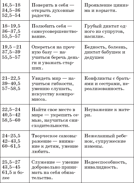 Ниже мы приводим возрастную таблицу завязок с кармическими узлами, разработанную эзотериками кармической медицины, в которой приведены кармические задачи для каждого возраста и главные родовые препятствия, которые мешают их решить. Пользуясь, ею вам будет легко распутать собственный клубочек кармических проблем. Просто найдите свой возрастной интервал в графе «возраст» и проанализируйте, идет ли в вашей жизни правильная отработка кармической задачи, что сильнее: родовое препятствие или ваша духовная сила при соблюдении задачи.