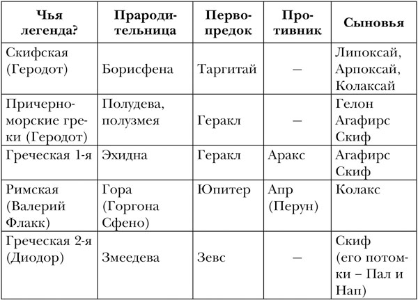 Рассказ Диодора имеет обобщающий характер, что позволяет подвести итоги нашего сравнения разных легенд (их данные для удобства сведены в таблицу). Все версии происхождения скифов связывают их с Русской равниной. Расширяя область своего влияния, они приходят на Кавказ и в Азию. Сообщение Геродота о том, что скифы, вытесненные массагетами, перешли Аракс и встретили киммерийцев, относится ко времени их возвращения на Русскую равнину, родину своих предков.