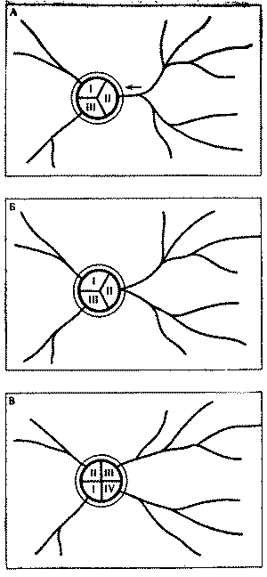 Образование новой колонны теснее связано со структурой кормового участка, с дорожной сетью муравейника. Возникновение колонны у рыжих лесных муравьев невозможно без появления новой дороги. Число разветвлений у той или иной дороги роли не играет. Важно не число ответвлений на территории, а число потоков, выходящих из гнездового купола. Поэтому процесс разделения колонны начинается всегда на кормовом участке, схематично он изображен на рис. 9. Из схемы видно, что разделение в большей степени зависит от возможности радикального раздвоения исходного кормового участка колонны. Чем шире занимаемый участком сектор, тем проще использующей его колонне разделиться на две. Число колонн и связанных с ними дорог у рыжих лесных муравьев весьма постоянно. Еще в 30-х годах появились работы немецкого энтомолога Р.Штегера, проследившего топографическое постоянство кормовых дорог в течение 13 лет. Имеются подобные данные и у других авторов, работавших с муравьями разных родов. Смещения отдельных ответвлений дорог обычно не связаны с изменением в составе колонн. А иногда разделение колонны на две почти не отражается на периферийных отрезках дорог (именно этот вариант показан на рис. 9, в).