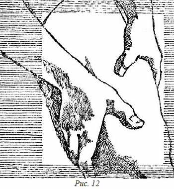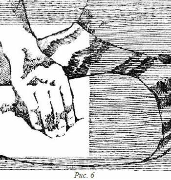 4) Разминание: а) ординарное – проводится по трем участкам бедра – внутреннему, переднему и наружному (рис. 6); б) двойной гриф – проводится так же, как и ординарное, с той лишь разницей, что вторая, свободная, рука выполняет роль отягощения; четыре пальца накладываются на четыре, а большой на большой; в) двойное кольцевое разминание проводится на внутренней части бедра (рис. 8). При этом туловище необходимо развернуть внутрь, а при массировании наружного участка бедра – наружу; г) продольное разминание. В положениях, когда ноги находятся на полу, проводят двойное ординарное разминание, которое выполняется сразу и на передней и на задней поверхностях бедра (рис. 12). Прием этот очень эффективен, особенно в походе, при сдаче норм ГТО, на соревнованиях, то есть в тех случаях, когда надо быстро восстановить работоспособность или подготовить мышцы к работе. Приведенный нами опыт убедительно показал, что этот прием дает хороший эффект и при статической работе на производстве.