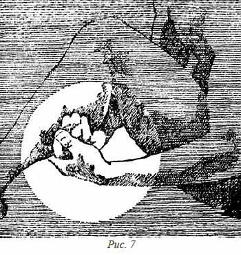 Двойной гриф. Этот прием применяется на крупных и сильно развитых мышцах (на икроножной мышце, на бедре). Он оказывает глубокое воздействие на массируемый участок. Техника выполнения двойного грифа такая же, как и при ординарном разминании, только одна рука отягощает другую с целью усиления воздействия. Для этого нужно положить кисть одной руки на кисть другой, так чтобы четыре пальца были под большим, а большой над четырьмя (рис. 7).