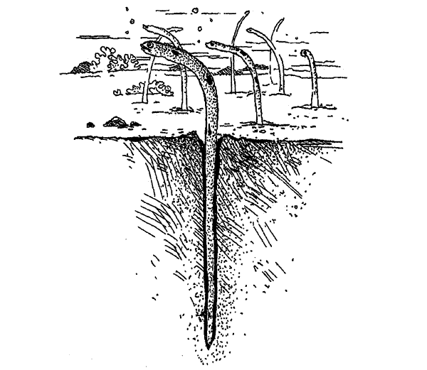 Зовут этих необычных рыбок трубчатыми угрями. Всю свою жизнь они проводят в норах, которые роют в грунте, а стенки для прочности скрепляют особым секретом. В таком домике, в случае опасности, они и прячутся.