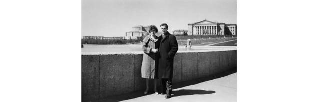 Рабочий Минского радиозавода имени Ленина Ли Харви Освальд с супругой на набережной Свислочи на фоне Большого театра оперы и балета, а также штаба Краснознамённого Белорусского военного округа.