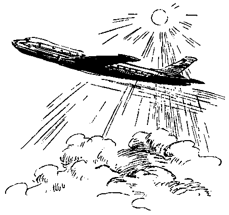 А он все мчался, мчался, и я даже не уловил того момента, когда колеса его оторвались от земли и мы уже оказались в воздухе. Аэродром, и дома, и лес стали уменьшаться, уменьшаться, пока совсем не исчезли. Самолет пробил облака так же быстро, как мы на уроке пробиваем карандашом белый листок бумаги, чтобы повертеть его пропеллером. Ну, а потом… Потом я увидел такую картину, какой еще ни один художник никогда, мне кажется, не изображал. Внизу, под нами, как сказочная, бесконечная снежная поляна, лежали облака, а вокруг были солнце и синева. Солнце, синева – и больше ничего! Чтобы облака были не надо мной, а подо мной – этого я еще никогда не видел! Наш самолет плыл, как белый айсберг, по синему воздушному океану (айсбергов я, конечно, никогда не видел, но читал о них в приключенческих книжках).