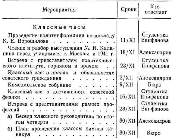 Анализ состояния класса. Учащиеся перешли в 10-й класс с крайне плохой успеваемостью. Три комсомольца остались на второй год, сам секретарь классного бюро ВЛКСМ едва выдержал осенние испытания. Неудовлетворительное состояние дисциплины. В первые же дни занятий три ученика были удалены с уроков. Как выяснилось, комсомольская работа в классе почти не велась. Классные часы и политинформации почти не проводились. Сами члены бюро не подавали примера ни в успеваемости, ни в дисциплине. В классе между мальчиками и девочками нет дружеских, товарищеских отношений. Мальчики стараются проводить время с девочками из школы № 1, устраивают вечера на квартирах. Это носит не совсем здоровый характер. В классе нет дружного, сплоченного коллектива.