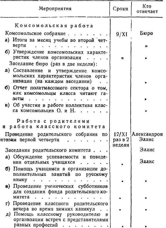 Анализ работы за первую четверть. Класс окончил первую четверть с общей успеваемостью 95,7 %. Не успевает один ученик (приехавший из другого города) по русскому и химии. Без троек окончило четверть четверо: Письменный, Горяинов, Андросов, Кофман. Низкая успеваемость по русскому языку, всего четыре ученика имеют четверки, и ни один не имеет пятерки. Неровны оценки по химии. Коллектив класса заметно сплотился, особенно во время работы на субботниках по утеплению класса и погрузке угля. Комсомольское бюро работает активно и довольно принципиально. Очень хорошо работает староста класса Андросов. Стали несколько сглаживаться неприязненные отношения между мальчиками и девочками. Особенно это сказалось во время подготовки и проведения классного вечера. Но не все ученики класса втянуты в коллектив. В стороне от коллектива, класса стоят Н. и О. Только в конце четверти, в связи с возвращением из отпуска председателя, начал работать классный родительский комитет.