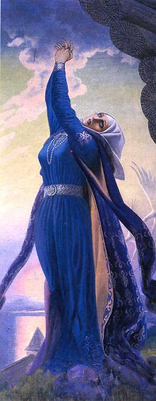 Другая работа, в которой художник сознательно использовал принцип театральной декорации, – «Плач Ярославны». Это правая часть задуманного, но не завершенного им триптиха, посвященного самому поэтическому сказанию старины – «Слову о полку Игореве».