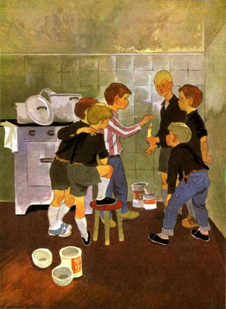 В большой кухне, сидя и даже лежа на полу, пять или шесть бойскаутов занимались тем, что толкли что-то в ступке и смешивали в стеклянных банках, а один парень, стоя коленями на высоком табурете, помешивал поварешкой что-то варившееся в двух объемистых кастрюлях, возвышавшихся на плите.