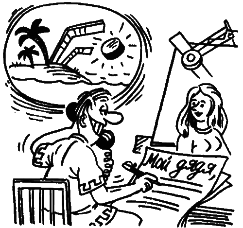 – Профи сильны – кто спорит – говорит Прутиков в телефонную трубку, которую прижимает ухом к плечу. Левая рука его держит дымящую сигарету, в то время как правая бойко набрасывает: «Дорогой дядя Филя! Рад сообщить тебе, что пока здоров, не болею…» Глаза Прутикова устремлены на сидящую наискосок практикантку. а лоб взборожден мыслью о предстоящем отпуске: «В Сочи махнуть, что ли?..»