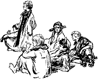 Они побежали туда и увидели толпу ребят, окруживших беспризорника Коровина. Он стоял, прижавшись спиной к стене, и глядел, как затравленный волчонок.