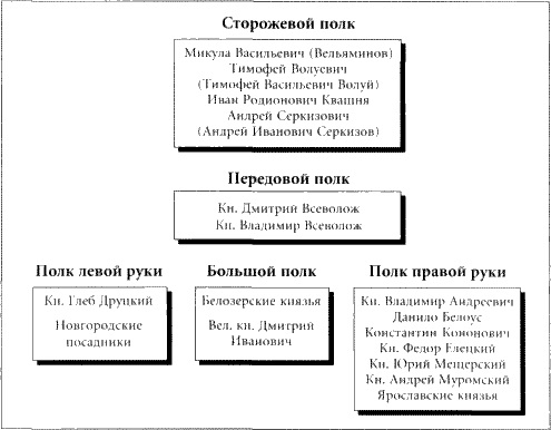 [Закрыть] и Константин Кононович, а также отряды из Ельца, Мурома, Мещеры и Ярославского княжества. В большом (или великом) полку были отряды из Белоозера и Москвы под главенством самого Дмитрия Ивановича. Полком левой руки руководил Глеб Брянский. Имя этого военачальника вызывает сомнения[105]105