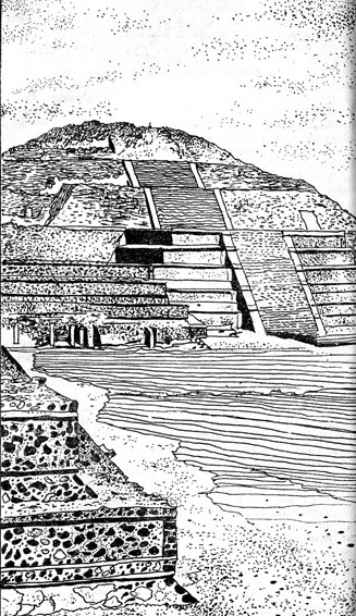 Пирамида Солнца покоилась на пятиступенчатом основании и вздымалась к небу семью ступенями. На двадцать три метра поднималась она над террасой, а вместе с ней достигала высоты сорок один метр. На ее строительство пошло около ста тридцати миллионов кирпичей из сырца!