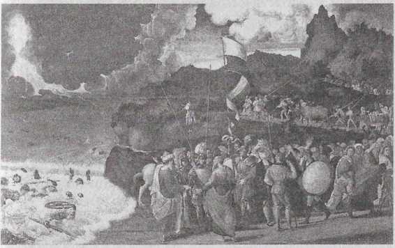 Мы подробно говорим об этом в книге «Библейская Русь», гл. 4. Войско фараона преследовало израильтян во главе с Моисеем. Подойдя к морю, Моисей и его люди перешли море как по суше. А когда настигающие враги бросились вдогонку, воды вернулись на прежнее место и солдаты фараона утонули, рис. 11, 12.