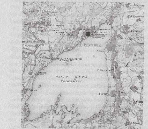 Старую карту озера Неро, на которой отмечен Авраамиев Богоявленский монастырь, см. на рис. 6. Хорошо видно, что Чудской конец Ростова, где расположен монастырь, находился на берегу северной, УЗКОЙ ЧАСТИ ОЗЕРА.