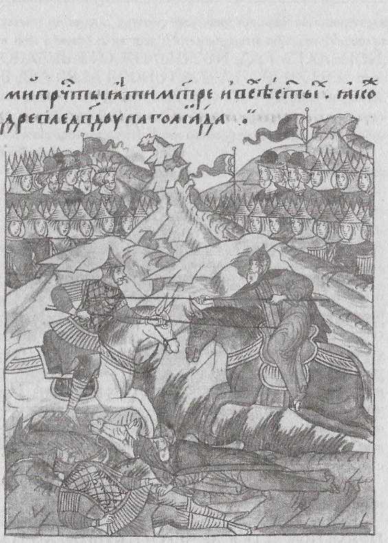 Рис. 66. Миниатюра из «Русского Лицевого Летописного Свода», изображающая поединок Пересвета с Челубеем. Взято из [490:4], « Русская летописная история», книга 9, с. 484, лист О-II-89, оборот