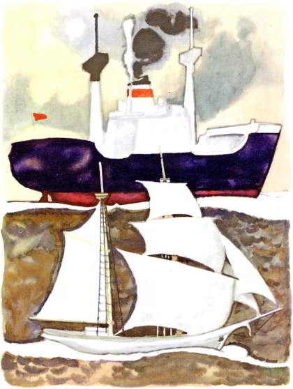Все в море знали шхуну. Океанские лайнеры, возвращаясь из кругосветных рейсов, гудели для неё басом, лодки у берега, подскакивая на волнах, кланялись ей. Шхуна была красива. Но на море одной красоты мало. И главным её достоинством было умение плавать. А как точно она вставала у причала! Как легко находила свою дорогу между кораблями, когда они толпились в порту!