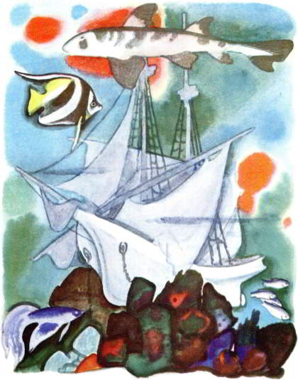 Борта шхуны, палубу, мачты облепили ракушки, оплели водоросли. Когда-то белая и лёгкая, шхуна напоминала теперь косматую скалу.