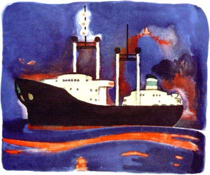 Корабль подошёл совсем близко. Бутылка видела его круглые светлые окна, шлюпки, затянутые брезентом, видела матросов, облокотившихся на поручни. А матросы не видели её. Они смотрели на небо, усыпанное созвездиями, как серебряным песком. Если бы крикнуть им: «Угугу! Остановитесь!» Но не могла бутылка крикнуть, её горлышко было залеплено смолой.