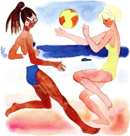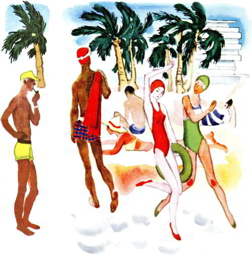Как-то на рассвете перед ней открылся берег. К утру она была совсем близко от него. Сразу за полосой прибоя, за жёлтым песком росли пальмы, стояли дома. Из домов к морю шли люди: они были в разноцветных купальных костюмах, на них были лёгкие шляпы с широкими полями, они несли зонтики, пёстрые мячи.