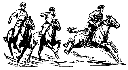 С дороги донесся частый конский топот. Из-за поворота показались всадники. Впереди, вытянув морду и раздувая ноздри, летела белая Оса, рядом, почти не уступая ей, мчались Буян и Серый. Дядя Андрей, Шакирзянов и Цюра в зеленых фуражках с опущенными на подбородки ремешками, низко пригнувшись к лошадям, подгоняя их криком и шпорами, неслись прямо на ребят.