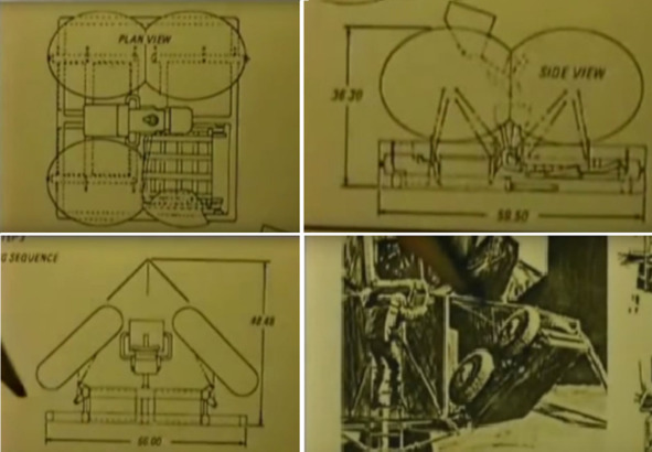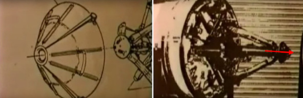 Представитель НАСА Фрэнк заявляет, что колеса улаживались под углом 90 градусов. Но, если учесть диаметр колес, то такое сложение невозможно. Колеса к платформе при сложении конструкции лунной телеги будут располагаться под углом 45 градусов. Колеса в таком положении будут выпирать больше. Кольер на схеме показывает, что при таких размерах колес, в соотношении с размерами рамы эти колеса лунной телеги НАСА не смогли складываться подобным образом без наложения одного колеса на другое. В этом нетрудно убедиться. Колеса при сложении соприкасаются друг с другом под каким-то углом, что толщина всей «лунной телеги» на боковой стороне «ЛМ» становится толще, чем это необходимо для помещения «ровера» в нишу «ЛМ». Впрочем, объяснение можно найти и в этом случае. Сказать, например, что Фрэнк ошибался, и неправильно разъяснил Кольеру. Кольеру в своем фильме вспомнил о звездной слепоте, от которой «космонавты» НАСА пытались лечиться с помощью ультрафиолетового телескопа. Кольер также обратил внимание, что если «космонавт» начнет входить в люк «ЛМ», то его голова упрется в порог, на котором стоит «двигатель». В проем узкого люка «космонавт» не проходит в раздутом скафандре.