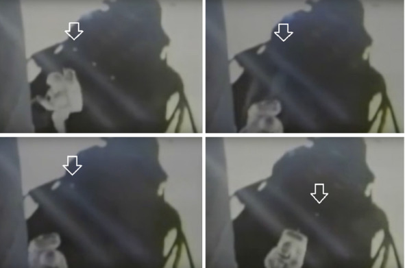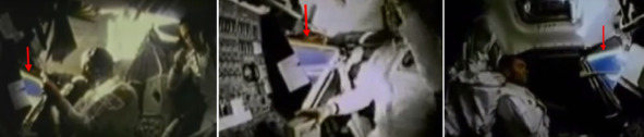 На кадрах «трансляции», выше стрелками отмечены светлые «дефекты» на стекле иллюминатора. Необходимо отметить и светлые прямоугольные полосы, которые в отличии от белых кружков, хорошо просматриваются на протяжении всего эпизода. По форме эти полосы напоминают люминесцентные лампы. Вероятно, что в «Лунном» модуле обосновали относительно просторную студию, в которой сидел кинооператор, и где на потолке были установлены лампы и точечные светильники.