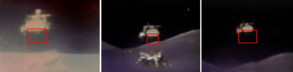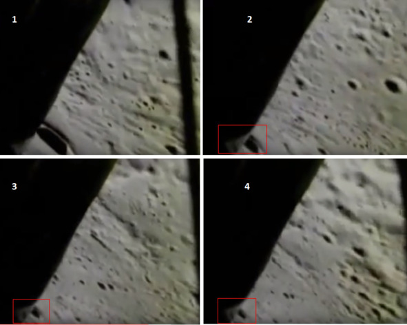Это существенное, очень заметное изменение освещения «ЛМ». Кадры показывают, что форма тени от стойки при съемках из кабины в момент выхода на «Луну» отличается от тени этой же стойки, через какое то время. Изменилось направление освещения «Солнца». При этом надо учесть, что на реальной Луне тени так за 3—4 часа измениться не могли. Лунный «день» длится больше, чем земной день. 14 земных суток это один день на Луне. На кадре телевизионной съемки или съемки с помощью телекамеры фигурка «космонавта» выглядит светлой. Это происходит потому, что на «Луне» США имеется источник рассеиваемого света. Он и делает костюм лунного актера очень светлым и хорошо видимым. Три светлых точки, это, скорее всего, отражение в стекле искусственных источников света. Потом они исчезают, и снова появляются единичные блики от включенных источников света внутри киностудии, размещенной в «ЛМ».