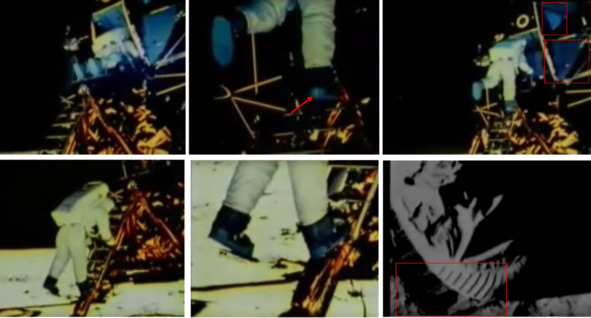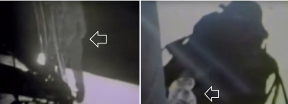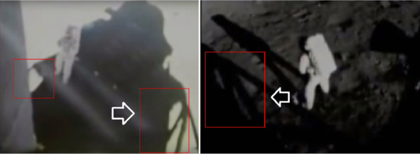 В своем фильме, Кольер высказал недоумение как одного и того же «космонавта» снимали на две телекамеры, в одно и тоже время с разных направлений, из иллюминатора «ЛМ» и с боку на лестнице. Американские пропагандисты, НАСА-фанатики объясняли это тем, что около лестницы телекамера работала автоматически, после ее включения Нейлом. А телекамера второго «космонавта» была включена в кабине «космонавтом «Олдрином». Обращает внимание другой аномальный факт. На кадрах хроники «лунной трансляции» с телекамеры около лестницы скафандр «космонавта» не подсвечен «лунным грунтом» или каким-то иным источником рассеиваемого света. Поэтому фигурка «космонавта» выглядит темной.