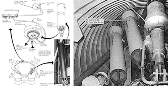 Простакам эти взрывы выдают как момент срабатывания РДТТ торможения первой ступени, которые находятся в хвостовой части этой самой ступени и направлены почти по направлению движения ракеты. Выброс из твердотопливных двигателей небольшого размера не могла образовать огромные облака пламени и дыма высокой плотности, а уж тем более череду таких вспышек: 3—4, как минимум. Такие глупости нет необходимости рассматривать и обсуждать. Чтобы скрыть этот самый интересный момент, американцы с помощью макетов ракеты и разделяющих ступеней, с помощью механического устройства, скрытого от кинокамеры частями модели, в аэродинамической трубе, при нормальном атмосферном давлении сняли кинокадры отделения первой ступени. Используя фейерверк, американские специалисты комбинированных съемок показали кинозрителям на основе макета ракеты и разделяющих ступеней, тот самый взрыв, вспышки, и выброс пламени и дыма исходил из средней части ракеты, а не из так называемых двигателей торможения РДТТ. Размеры и масса этих двигателей торможения по сравнению с размерами и массой ракеты, которые декларировало НАСА, были просто ничтожными. Описание этих РДТТ, версия НАСА: «Тяга каждого тормозного РДТТ около 38 т (зависит от температуры), эффективное время работы 0,67 секунд. Наиболее крупными являются тормозные РДТТ первой ступени; их высота 2,24 м, диаметр 0,39 м, масса 228 кг (в том числе 126 кг топлива).