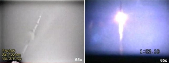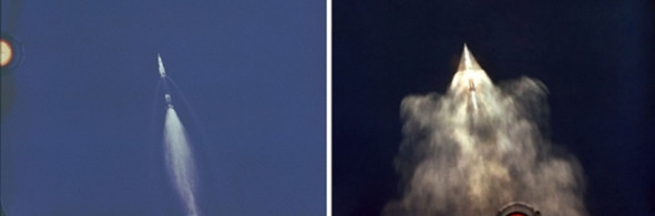 Наименьшие РДТТ, обеспечивающие «осадку» топлива в баках третьей ступени, содержат по 27 кг топлива. [5] Г.А Назаров, В. И. Прищепа, «Космические твердотопливные двигатели». Конструкция небольших РДТТ показывает, что такие РДТТ не могли создать огромные облака пламени и дыма диаметром 200 метров и более. Эти РДТТ в комбинированных съемках заменили обычными «фонариками», свет которых хорошо выделялся на фоне закопченной дымом фейерверка первой ступени. Снимался макет в аэродинамической трубе. Детали иллюминатора на фотографиях НАСА имеют такую же резкость, как изображение ракеты, которая по версии НАСА, находилась далеко от стекла иллюминатора. Это противоречит законам Оптики. Остается признать, что иллюминатор и ракета находились от фотоаппарата на практически одном расстоянии от аппаратуры съемки. Макет ракеты и детали иллюминатора отделяли не более двух – трех метров. Ниже, слева кадр хорошего качества размещен на сайте НАСА. [6] Справа кадр, тоже хорошего качества, показывает момент «взрыва», снимок размещен на сайте НАСА. [7] На этих кадрах выбросы или пламени или горючего из сопла «двигателей» первой ступени демонстрируют факт, что событие произошло при нормальном атмосферном давлении.