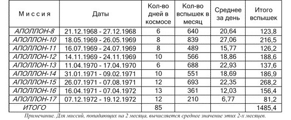 Самым важным моментом книги Рене, наверное, необходимо признать его попытку исследовать защиту от радиации у «космических аппаратов» из программы «Аполлон». Здесь все было прекрасно: никакой защиты от солнечных вспышек у американцев не было. Этот факт признавали сами фальсификаторы. Рене составил таблицу возникновения солнечных вспышек с период осуществления «лунных полетов». Из этой таблицы следует, что американским «космонавтам невероятно повезло!