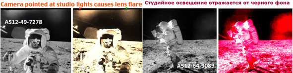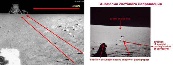 Джек Вайт этого не понимал и упорно искал проявление неправильного освещения таких источников света. На самом деле описанной ситуации не было. Джек сражался с ветряными мельницами. Он рисовал направление освещения света некорректно. Джек не понимал роли искажения направления освещения плоским изображением, проекцией на двухмерной площади трехмерного пространства. При рассмотрении фотографий из шоу «Аполлон-12» Джек откровенно неправильно указывает направление освещения. Он это делал, чтобы доказать понравившуюся ему гипотезу, в ущерб истине. Стрелки направления освещения можно нарисовать разными способами.